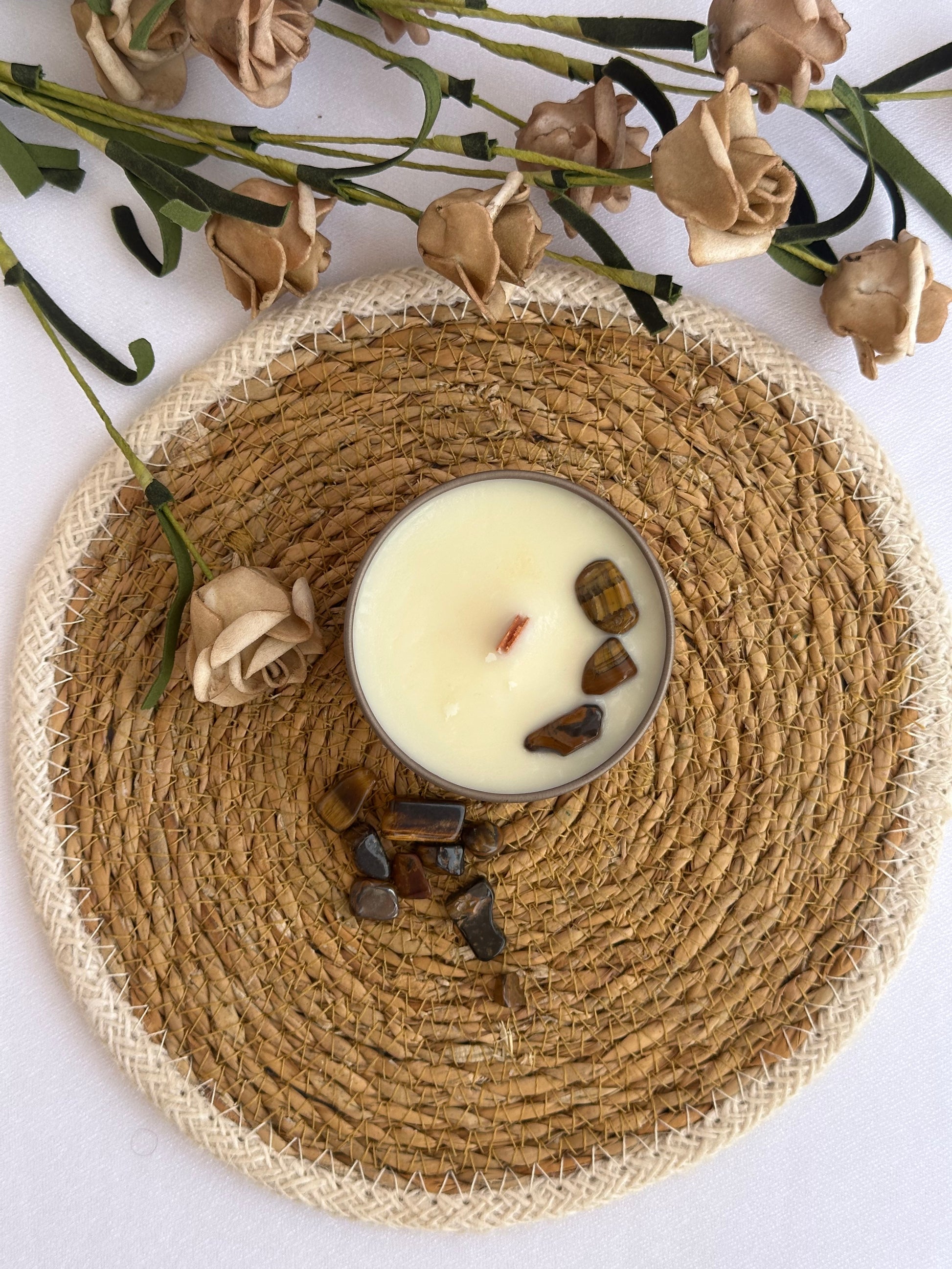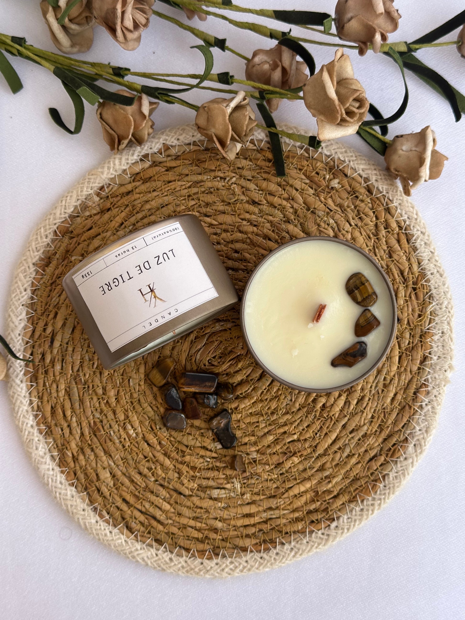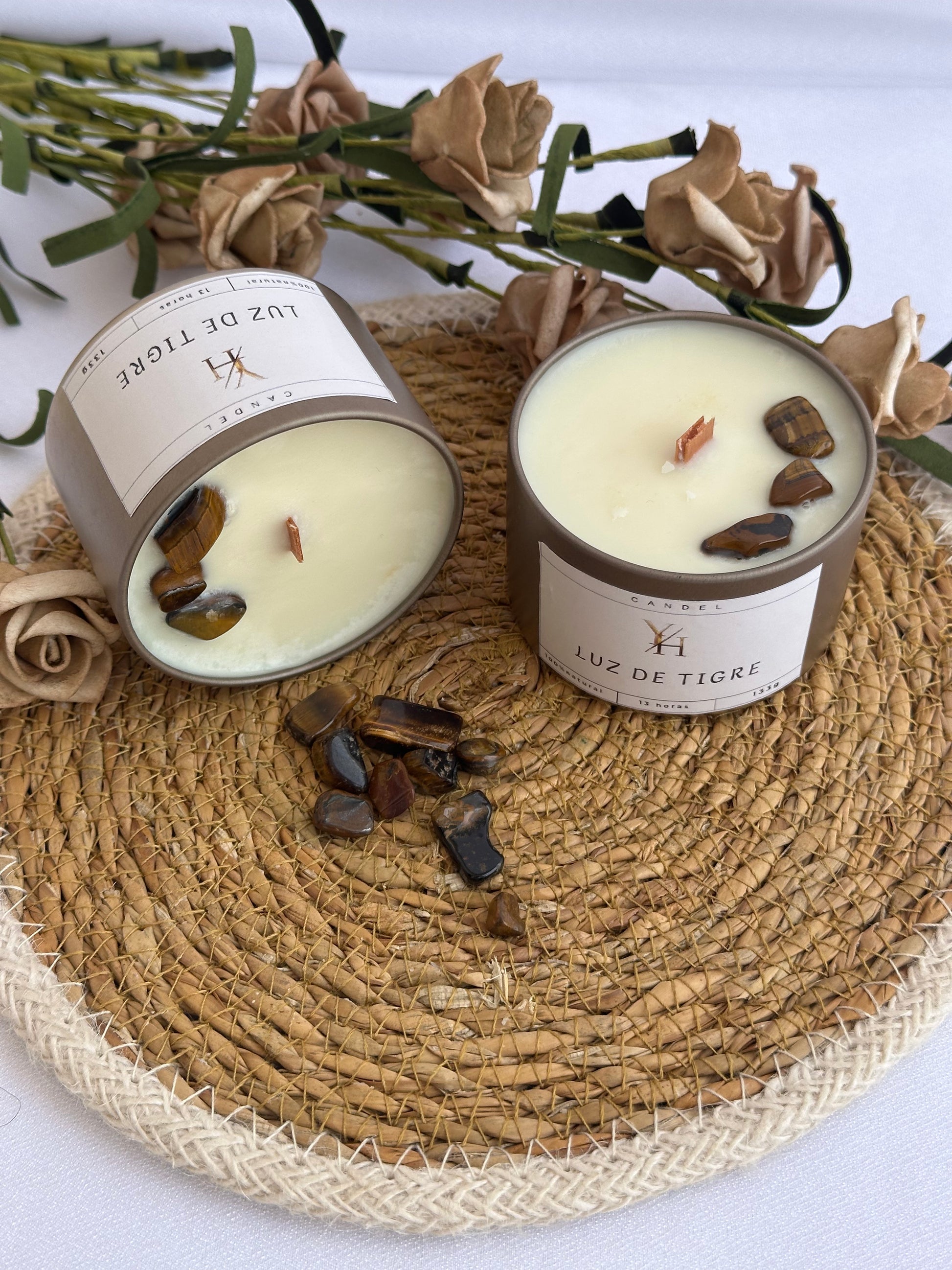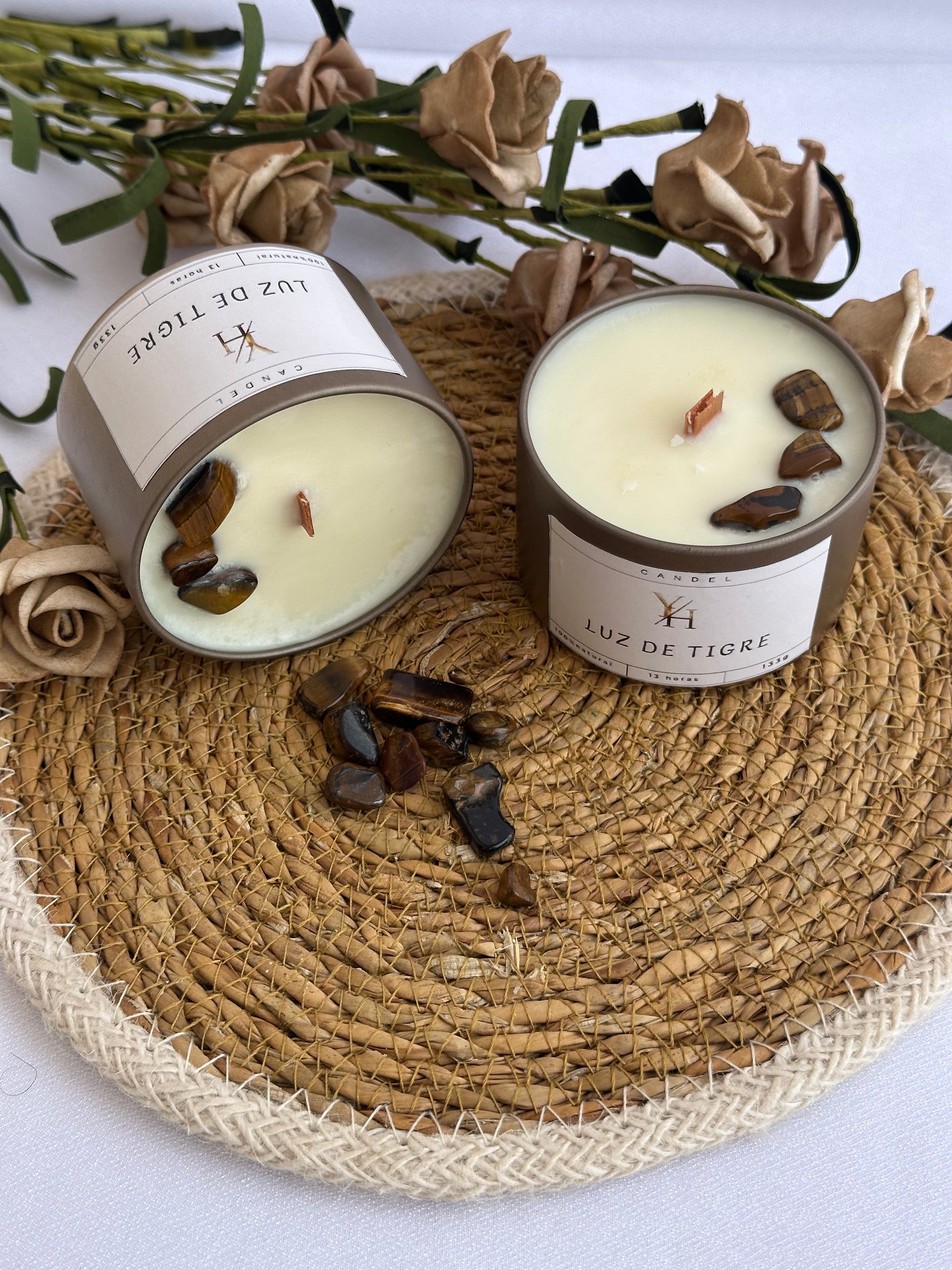 Vela artesanal “Luz de Tigre” – con piedra natural Ojo de Tigre y cuatro aromas