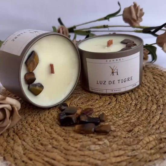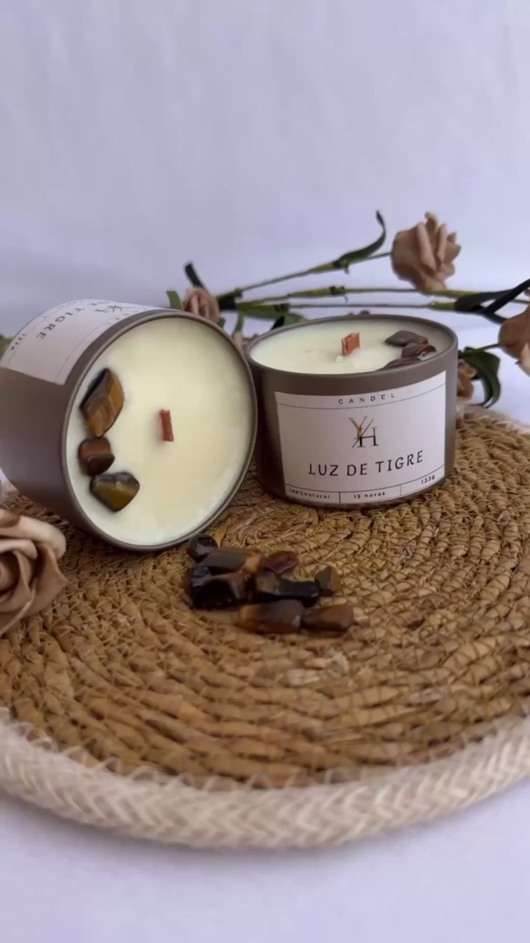 La vela artesanal Luz de Tigre está hecha a mano con cera de soja 100% natural y decorada con auténticas piedras naturales de ojo de tigre, símbolo de protección, fuerza y energía positiva.